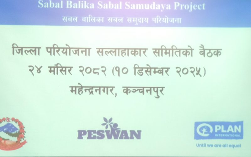 महेन्द्रनगर २४ मङ्सिर ।प्लान ईन्टरनेशनल र वातावरण सरक्षण तथा समाज कल्याण संघ नेपाल र पेशवानको संयुक्त साझेदारीमा ‘सबल बालिका सबल समुदाय’ परिजना लागु भएको छ। कंचनपुरको भिमदत्त नगरपालिका र दोधारा चादनी नगरपालिकामा बालबिवाह रोक्नकालागी सबल बालबालिका सबल समुदाय परियोजना लागुभएको छ।बुधबार जिल्लाका परियोजना सल्लाहकार समितिसंग आयोजित छलफल कार्यक्रलममा प्लान ईन्टरनेशलका कार्यक्रम अधिकृत रमेश घिमिरेले बालविवाह निरन्तर हुन थालेपछि रोक्नका लागि कार्यक्रम लागु गरिएको बताए । उनका अनुसार सुदूरपश्चिमको बाजुरा र कञ्चनपुरमा उक्त कार्यक्रम लागु भएको छ । कञ्चनपुरको भीमदत्त नगरका १, ३, १३ र दोधाराचाँदनी नगरका ३, ७ , १० वडाहरुमा कार्यक्रम लागु हुनेछ । दुवै पालिका ६ वडाहरुमा २का दरले १२ वडा किशोरी क्लब समुह गठन गरिएको, अभिभावक, सरोकारवालासंग सचेतना कक्षा संचालन गरिएको बताए ।